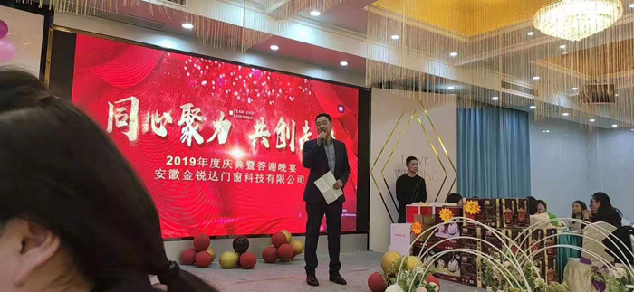 時光飛逝,歲月如梭,轉(zhuǎn)眼間忙碌的2019年已過去,充滿期待的2020年向我們走來。新的一年,孕育新的目標(biāo)和希望。安徽金銳達(dá)門窗科技有限公司2019年年會于1月22日在膳源假日酒店隆重舉行,公司全體員工歡聚一堂,共度聯(lián)歡。